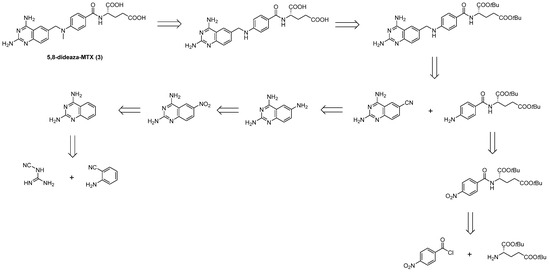 The described route for the preparation of 5,8-dideaza MTX analog (3): convergent synthesis from quinazoline and aminobenzoylglutamate precursors obtained in four and two steps, respectively [15,21].