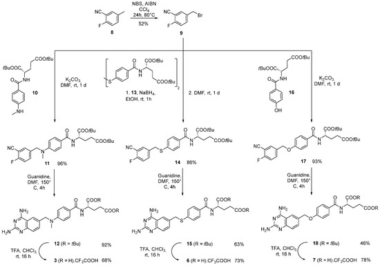 First, we synthesized the 5-(bromomethyl)-2-fluorobenzonitrile 9, the common intermediate for the preparation of the analogs. Starting from 2-fluoro-5-methylbenzonitrile 8, a Wohl–Ziegler reaction was carried out using a described procedure with azobisisobutyronitrile (AIBN) as a radical initiator and N-bromosuccinimide (NBS) as the source of bromine radicals [22,23] and afforded 9 in a 52% yield. A nucleophilic substitution between bromobenzyl 9 and the previously prepared N-methyl aniline 10 was achieved in dry DMF at room temperature and in the presence of anhydrous K2CO3 to give 11 in an almost quantitative yield. The 2,4-diaminoquinazoline 12 was formed by reacting the benzonitrile 11 with guanidine carbonate in DMF at 150 °C [24]. The 5,8-dideaza analog of MTX (3) was then obtained by the deprotection of the tert-butyl groups of 12 with TFA in 85% yield. Analog 3 was, therefore, prepared as the TFA salt in five steps in a ~31% yield, which includes the preparation of the intermediate 10 in one step. This synthesis was more efficient and concise than the one previously reported in nine steps with an overall yield of 12% [15,21].