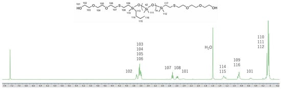 The thiol-ene reaction was adopted as a strategy for introducing oligoethyleneoxides into oligosiloxanes [19,20]. Herein, we synthesized ethanol-modified siloxane 1 and dioxyethylene ethanol-modified siloxane 2.