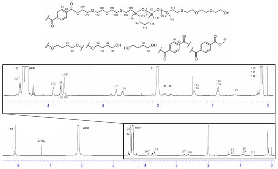 The 1H NMR spectra of siloxane 2 and Si-PBT are shown in Figure 1 and Figure 2. In Figure 2, the disappearance of the 3.73 ppm peak assigned to H102, along with the appearance of the 4.50 ppm peak (H102′) and the 3.90 ppm peak (H103′), indicates that copolymerization between siloxane 2 and PBT was successfully achieved. The composition ratio of repeating units in Si-PBT, calculated from both the monomer feed ratio and the ratio determined by 1H NMR analysis, is shown in Table 2. These results confirm that no decomposition or volatilization of siloxane occurred, and that copolymerization proceeded successfully while maintaining the intended composition ratio.
