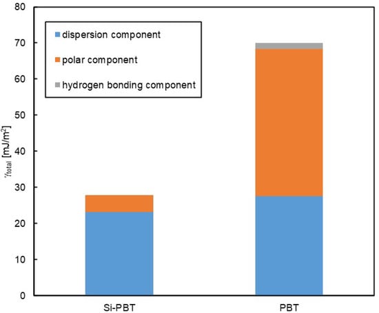To conduct a more detailed analysis, surface free energy component analysis was performed using the Kitazaki–Hata theory [25]. The results are presented in Table 7 and Figure 5. According to this theory, the surface free energy (γ) is divided into three components: the dispersion component (γd), the polar component (γp), and the hydrogen bonding component (γh). In Si-PBT, a significant reduction in the polar component was observed. This suggests that the siloxane backbone, which has lower polarity than polyester, is preferentially distributed to the surface, thereby reducing surface polarity and lowering the total surface free energy. As intended, the incorporation of the siloxane backbone successfully reduced the surface energy of the polyester.