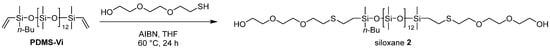 An argon-purged Schlenk flask equipped with a stir bar was charged with AIBN (19.7 mg, 0.12 mmol) and anhydrous THF (10 mL). The solution was stirred for 5 min at room temperature and PDMS-Vi (6.21 mL, 5 mmol) was added. The mixture was heated to 40 °C and after stirring for 10 min, 2-[2-(2-Mercapto Ethoxy)ethoxy]ethanol (2.15 mL, 15 mmol) was added dropwise at 40 °C. The mixture was then heated to 60 °C and stirred at 60 °C for 24 h. After the reaction, the mixture was cooled to room temperature and quenched with saturated NaHCO3 aqueous solution (20 mL). The resulting mixture was extracted with CH2Cl2 three times, and the gathered organic layer was washed with water three times and brine two times, and dried over anhydrous Na2SO4. After filtration, the solvent was removed using a rotary evaporator to afford siloxane 2 (5.90 g, 4.01 mmol, 81% yield) as a slightly yellow, viscous oil. The characterization data are listed in the Supporting Information.