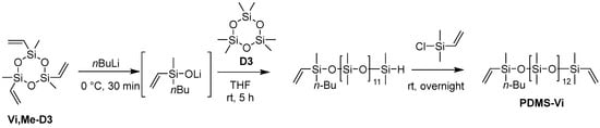 The targeted polyester-friendly siloxane-based comonomers were designed to slightly increase the polarity of the siloxane. Specifically, oligosiloxanes modified with oligoethyleneoxides at both termini (Scheme 1 and Scheme 2) were synthesized. The starting compound PDMS-Vi was synthesized by ring opening polymerization (ROP) of hexamethylcyclotrisiloxane (D3) using an appropriate initiator and end-capping agent (Scheme 3). The degree of polymerization was adjusted so that each molecule contained 14 silicon atoms. Short siloxane chains cannot achieve hydrophobicity and low-temperature impact resistance because polysiloxane forms one helix per six silicone atoms [13,14,15]. On the other hand, long siloxane chains deteriorate compatibility with polyester, as the long siloxane chains reduce the overall molecular polarity [16,17,18].