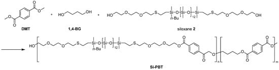 - Anisimov, A.A.; Kuvandykova, E.A.; Buzina, A.I.; Muzafarov, A.M. Synthesis of siloxane analogue of polyethylene terephthalate. Mendeleev Commun. 2019, 29, 461–462. [Google Scholar] [CrossRef]