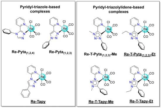 Chemical structures of the pyridyl-triazole-based complexes (Re-Pyta(1,2,4) [24], Re-Pyta(1,2,3) [32], and Re-Tapy) and pyridyl-triazolylidene-based complexes (Re-T-Pyta(1,2,3)-Me [32], Re-T-Pyta(1,2,3)-Et, Re-T-Tapy-Me, and Re-T-Tapy-Et). The new complexes synthesized for this study are underlined.