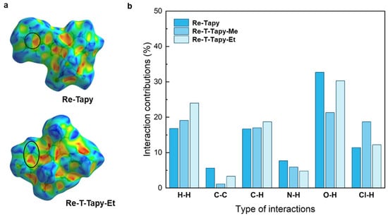 (a) Hirshfeld surfaces of Re-Tapy and Re-T-Tapy-Et plotted over shape index. (b) Comparison of contributions of various interactions to the HS of Re-Tapy, Re-T-Tapy-Me, and Re-T-Tapy-Et.