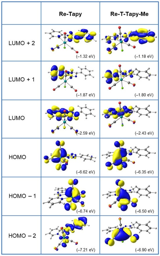 Isodensity plots (isovalue = 0.03 e bohr−3) and energy levels of the first frontier molecular orbitals, for complexes Re-Tapy and Re-T-Tapy-Me in DCM, according to DFT calculations at the PBE1PBE/LANL2DZ level of theory.