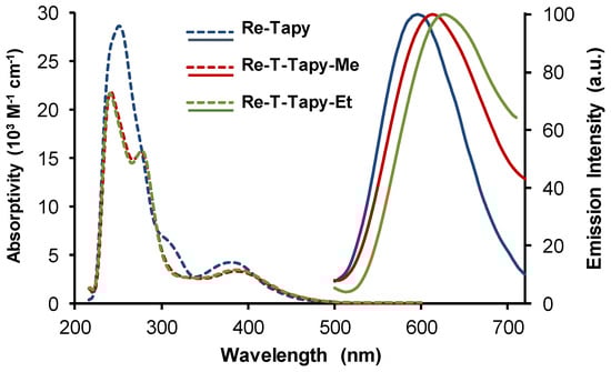 UV-vis absorption spectra of Re-Tapy, Re-T-Tapy-Me, and Re-T-Tapy-Et (~4 × 10−5 M) in dichloromethane and normalized emission spectra of these complexes (~2 × 10−5 M) in aerated (solid lines) solutions. λex = 390 nm.