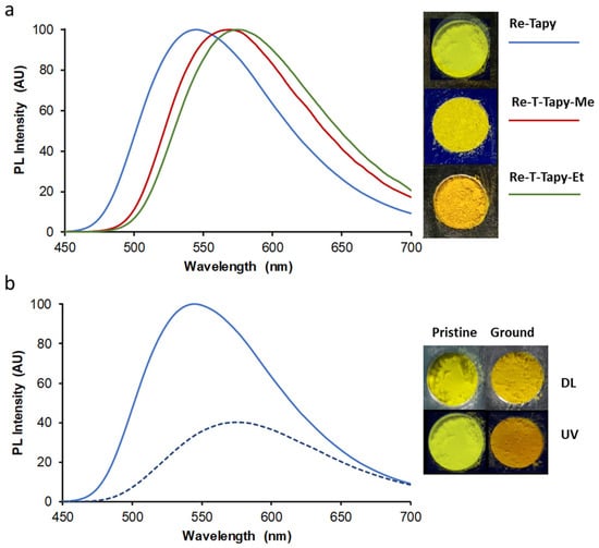 (a) Normalized emission spectra of Re-Tapy (blue line), Re-T-Tapy-Me (red line) and Re-T-Tapy-Et (green line) as pristine powders (λex = 380 nm) and images of the corresponding samples under UV illumination (365 nm). (b) Emission spectra of Re-Tapy as pristine powder (solid line) and after grinding (dotted line). The spectrum height at the emission maximum is proportional to PLQY. Inset: images of the corresponding samples in the daylight and under UV illumination.