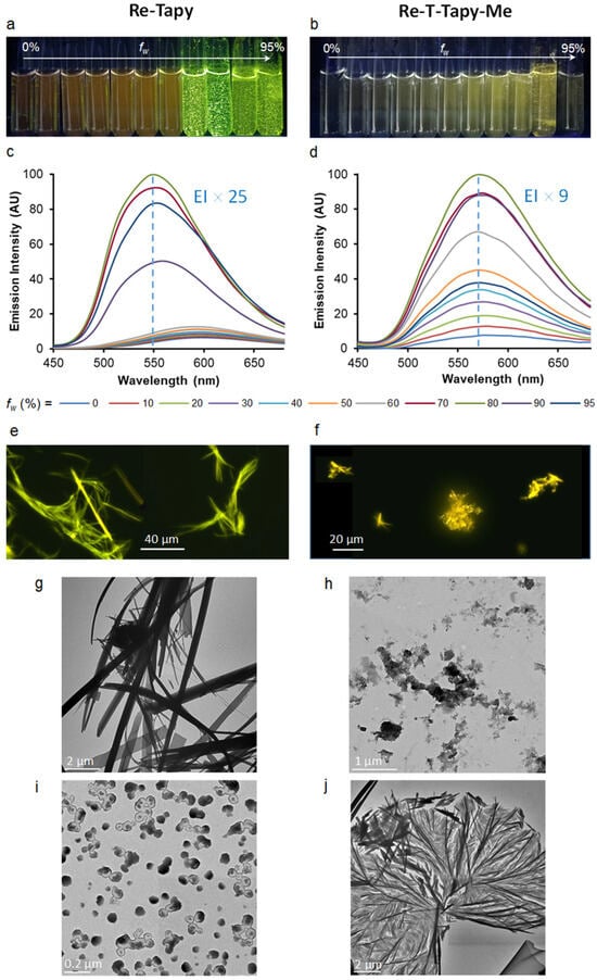 Samples of (a) Re-Tapy (5 × 10−5 M) and (b) Re-T-Tapy-Me (5 × 10−5 M) in acetonitrile solutions containing 0 to 95% water, illuminated by UV light (365 nm); (c,d) evolution of the corresponding normalized emission spectra (λex = 380 nm and 360 nm, respectively, same color code); (e,f) fluorescence microscopy images of the suspensions at fw = 80%. (g,h) TEM images of the suspensions at fw = 80%. (i,j) TEM images of the suspensions at fw = 95%.