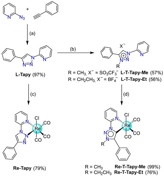1-Phenyl-4-(2-pyridyl)-1,2,3-triazole (L-Pyta(1,2,3)) [59], 2-(4-phenyl-1,2,3-triazol-1-yl)pyridine (L-Tapy) [43], and complex Re-Tapy [43] were prepared as described in the literature.