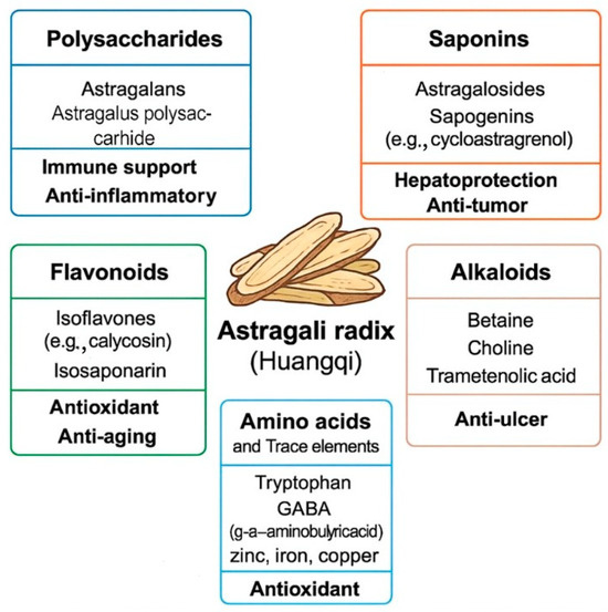 Within the group of these constituents, APS are the most extensively studied due to their potent immunomodulatory and antitumour activities. APS are acidic heteropolysaccharides composed mainly of glucose, galactose, arabinose, and rhamnose [8,9,10]. Their pharmacological efficacy is closely related to their molecular weight, monosaccharide composition, and glycosidic linkage patterns. Notably, alcohol-soluble fractions of APS, enriched in mannose and galactose, display enhanced anti-inflammatory and antioxidant properties [11]. Triterpenoid saponins represent another crucial class of active compounds in Astragali radix, particularly astragalosides I–IV and cycloastragenol derivatives. These compounds have shown pronounced cardioprotective, hepatoprotective, neuroprotective, and anti-inflammatory effects [12]. Astragaloside IV is known to modulate calcium homeostasis, inhibit pro-inflammatory signalling pathways such as NF-κB and STAT3, and improve mitochondrial function [13,14]. Flavonoids, including calycosin, formononetin, isorhamnetin, and quercetin, are mainly found in glycosylated and malonylated forms. These polyphenolic compounds contribute significantly to the antioxidant, anti-inflammatory, and oestrogen-like activities of the herb. Their pharmacological efficacy varies with plant maturity, geographical origin, and harvesting season [15,16]. Astragali radix also contains a spectrum of amino acids (e.g., proline, glutamic acid, arginine), vitamins (e.g., folic acid), and organic acids (e.g., ferulic acid, caffeic acid), which contribute to nutritional support and immune enhancement [17]. In addition, the herb accumulates trace elements such as selenium, zinc, manganese, and iron—micronutrients that play essential roles in antioxidant defence systems and enzymatic catalysis. Table 1 summarises the major bioactive components of Astragali radix (Huangqi), including their representative compounds, and primary biological activities.