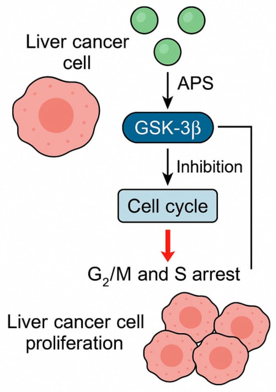 In Liu et al.’s [34] study, HepG2 cells were treated with APS (100, 200, and 400 μg/mL) for 5 h, and MTT assay results showed that the absorbance values in all treatment groups from day 1 to day 7 were significantly lower than those of the control group (p < 0.05), with the 200 μg/mL group exhibiting the strongest inhibitory effect. Western blot analysis revealed that the expression of the glycogen synthase kinase-3β (GSK3β) protein was significantly reduced in all APS-treated groups compared to the control (p < 0.05), and the trend was consistent with the changes observed in absorbance. This demonstrated that APS significantly inhibited the proliferation of HepG2 cells by downregulating the expression of glycogen synthase kinase-3β (GSK-3β), with 200 μg/mL being the most effective concentration. Another study, using a CCK-8 assay, a colony formation assay, and flow cytometry, found that high concentrations of APS (≥800 μg/mL) significantly inhibited cell proliferation, while even low concentrations (100 μg/mL) suppressed colony formation. Flow cytometry results showed a reduction in the proportion of cells in the G2/M phase (10.1% in the control group vs. 2.3–5.5% in the treatment groups) and an increase in the apoptosis rate (7.03% in the control group vs. 9.31–21.89% in the treatment groups). APS markedly suppressed both proliferation and colony formation in HepG2.215 cells. Treatment with 1000 μg/mL of APS for 48 h resulted in a 39.80% inhibition rate, while even a lower concentration of 100 μg/mL significantly reduced colony formation. Mechanistically, APS exerted these effects by inducing cell cycle arrest at the G2/M and S phases, thereby impeding tumour cell proliferation [35]. Given the crucial role of cell cycle regulation in cancer progression, these findings underscore the therapeutic potential of APS as an agent capable of exerting cytostatic effects through modulation of the key cell cycle regulators. These are shown in Figure 2, which shows that APS suppress the expression and activity of glycogen synthase kinase-3β (GSK-3β) in liver cancer cells, leading to the disruption of the cell cycle. This inhibition results in the G2/M and S phase arrest, thereby effectively reducing cancer cell proliferation. The cell cycle blockade induced by APS contributes to its overall antiproliferative effects against hepatocellular carcinoma.