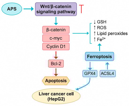 Inhibitory effect of Astragalus polysaccharides (APS) on Wnt/β-catenin signalling and induction of apoptosis and ferroptosis in liver cancer cells. The ┬ line means inhibition.