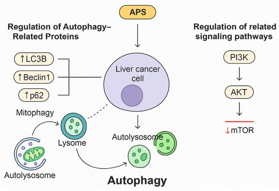 Autophagy is a lysosome-dependent cellular process that degrades damaged intracellular structures to maintain cellular homeostasis and provide essential substrates for protein synthesis and energy production. It is considered a form of programmed cell death. Dysregulation of autophagy has been associated with tumour development and can interfere with tumour cell apoptosis, angiogenesis, and anticancer treatments [53,54]. Treatment with APS (25 μg/mL) combined with 10 μmol/L of the Akt inhibitor LY294002 for 72 h reduced the survival rate of HepG2 cells to 13.4%, suggesting that APS may regulate autophagy in liver cancer cells by modulating autophagy-related genes and the key signalling pathways. APS inhibited cell viability in a dose-dependent manner, induced G1 phase arrest and apoptosis (with a maximum apoptosis rate of 41.92%), and promoted autophagy by upregulating LC3B while downregulating LC3A and P62. It also inhibited the Akt/p-Akt signalling pathway. When combined with LY294002, apoptosis was further enhanced (apoptosis rate of 58.16%), indicating that APS suppressed hepatoma cell proliferation through dual mechanisms: activation of autophagy and inhibition of the Akt pathway. These findings suggest a novel therapeutic target for liver cancer treatment. Specifically, APS have been shown to upregulate the expression of autophagy-related proteins such as LC3B, Beclin-1, and Atg5, thereby promoting the formation and maturation of autophagosomes. Concurrently, APS inhibit the PI3K/AKT/mTOR signalling pathway, which is a central negative regulator of autophagy. This suppression leads to enhanced autophagic activity, which in some contexts contributes to autophagic cell death.