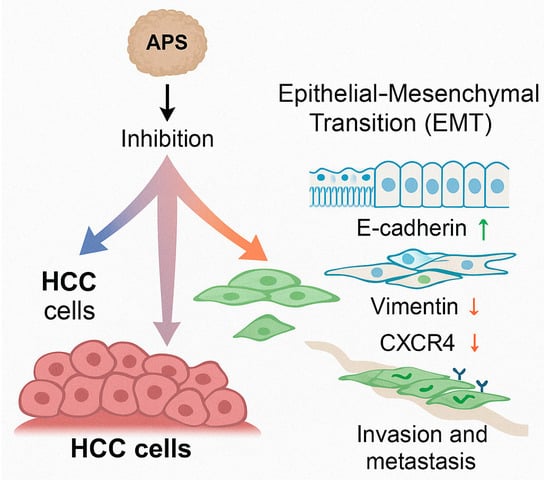 Hepatocellular carcinoma is characterised by its high invasiveness and metastatic potential, which significantly contribute to the poor prognosis observed in clinical oncology [60]. Studies have revealed that the EMT is a critical mechanism by which tumour cells acquire migratory and invasive capabilities [61]. Bai et al. [58] investigated the effect of APS on the EMT in hepatocellular carcinoma HepG2 cells and demonstrated that APS inhibited cell proliferation and invasion in a dose-dependent manner. Mechanistically, APS upregulated the epithelial marker E-cadherin while downregulating the mesenchymal marker vimentin and the chemokine receptor CXCR4 at both mRNA and protein levels, suggesting that APS suppress liver cancer cell growth and metastasis by inhibiting the EMT process (Figure 5), which illustrates the inhibitory role of APS on the EMT and metastatic progression in hepatocellular carcinoma (HCC) cells. APS treatment suppresses the EMT process by upregulating epithelial markers such as E-cadherin while downregulating mesenchymal markers, including vimentin and chemokine receptor CXCR4. This regulation of EMT-related molecules contributes to the inhibition of tumour cell invasion and metastasis. Thereby, APS limit the migratory and invasive behaviour of HCC cells, underscoring its therapeutic potential in preventing liver cancer dissemination.