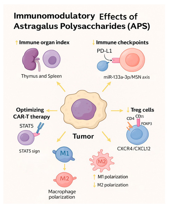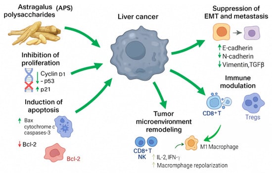 Immunomodulatory mechanisms of Astragalus polysaccharides (APS) in liver cancer.