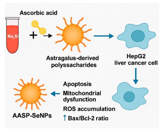Nanotechnology has been widely applied in the biomedical field, and selenium nanoparticles (SeNPs) have emerged as a focal point for research in targeted drug delivery for cancer treatment due to their unique anticancer mechanisms, favourable pharmaceutical properties, and inhibitory effects on tumour cells [78]. The preparation of polysaccharide–SeNP composites typically involves using sodium selenite (Na2SeO3) as the precursor and ascorbic acid (Vc) as the reducing agent, with synthesis carried out via a chemical reduction method in a polysaccharide solution. Two primary methods are employed: either pre-mixing the polysaccharide with sodium selenite or pre-mixing the polysaccharide with the reducing agent, followed by the addition of sodium selenite [79]. Ji et al. [80] provided important insights into the application of nanotechnology in liver cancer treatment by developing a novel composite of alcohol-soluble polysaccharides extracted from Astragalus membranaceus (AASP) modified with selenium nanoparticles (SeNPs), termed AASP–SeNPs. This composite was synthesised through the reaction of sodium selenite with AASP at a mass ratio of 1:20, resulting in uniformly spherical nanoparticles with an average diameter of 49.80 nm. These nanoparticles exhibited excellent dispersibility and stability in aqueous solutions.