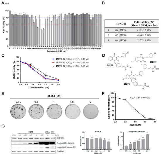 Identification of novel HDAC6 inhibitors against ES-2 ovarian cancer cells. (A) Determination of the antiproliferative effect of 46 potential selective HDAC6 inhibitors in ES-2 cells. ES-2 cells were treated with 1.25 μM compounds for 72 h and cell viability was measured by the MTT assay. (B) Cell viability of three most potent compounds. HDAC6i: HDAC6 inhibitor. (C) Dose–response curves of the three most potent compounds, 25276, 25253, and 25278, in ES-2 cells treated for 72 h. (D) Chemical structures of 25253, 25278, and 25276. (E) Colony formation assay of 25253 in ES-2 cells. ES-2 cells were treated with indicated concentrations of 25253 for 24 h and then cultured in drug-free medium for 9 days. Colonies were stained with crystal violet. (F) Quantitative data of colony formation assay. (G) 25253 selectively inhibited HDAC6 determined by Western blot analysis. Data are presented as mean ± SEM of at least three independent experiments. * p < 0.05, ** p < 0.01, and *** p < 0.001 vs. the vehicle control (CTL).