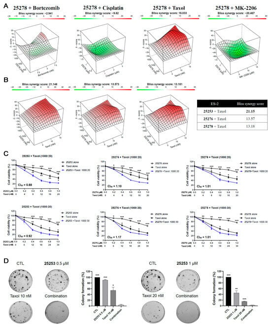 To develop a potential combination treatment strategy using HDAC6 inhibitors against ovarian cancer, 25278, one of the most potent compounds, was used for a preliminary test in combination with anticancer agents including paclitaxel (Taxol), bortezomib, cisplatin, and MK-2206 by the MTT assay in ES-2 cells. The combination effect was calculated using SynergyFinder 3.0 software (SynergyFinder: Helsinki, Finland, 2022) with overall effectiveness presented as the synergy score (SC). An SC >10 indicates synergistic activity, between 10 and −10 indicates an additive effect, and below −10 indicates antagonistic activity [13]. As shown in Figure 2A, 25278 combined with bortezomib and cisplatin only had an additive effect (SC of −2.94 and −9.82, respectively) while the combination of 25278 and MK-2206 had a slightly antagonistic effect. Strikingly, combining 25278 with Taxol showed a synergistic effect, with an SC of 16.03. Thus, Taxol was chosen for further combination tests with 25253, 25276, and 25278.