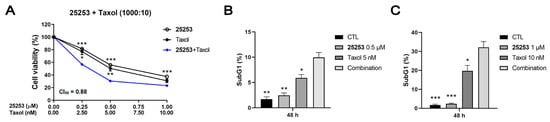 The combination effect of 25253 and Taxol in TOV21G cells. (A) The combination of 25253 with Taxol showed synergy in TOV21G cells based on combination index calculated by CompuSyn. Cells were treated for 72 h and cell viability was determined by the MTT assay. (B) The combination of 0.5 μM 25253 and 5 nM Taxol synergistically induced cell death in TOV21G cells. (C) The combination of 1 μM 25253 and 10 nM Taxol synergistically induced cell death in TOV21G cells. Cells were treated for 48 h and subjected to PI staining and flow cytometric analysis to determine the subG1 population. Quantitative data are presented as mean ± SEM of at least three independent experiments. * p < 0.05, ** p < 0.01, *** p < 0.001 vs. combination.