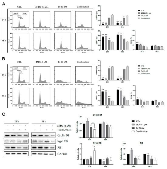 Western blot analysis revealed that both 20 nM Taxol and the combination of 1 μM 25253 and 20 nM Taxol significantly downregulated cyclin D1 relative to the vehicle control, and the combination group showed stronger downregulation compared to Taxol alone (p < 0.05) at 24 h with concomitant increases in hypophosphorylated RB levels and decreases in total RB levels, indicative of G0/G1 arrest (Figure 4C), which was the opposite to the data shown in Figure 4A,B with reduced G0/G1 populations obtained from PI staining. These results indicated that under low concentration (20 nM) Taxol treatment, cells were clustered at the subG1 phase, and 25253 further increased this population; Western blot analysis provided evidence supporting the possibility that part of the subG1 cells induced by Taxol or the combination of Taxol and 25253 at 24 h might be small, viable G1 cells exited from prolonged multipolar mitosis rather than apoptotic cells.