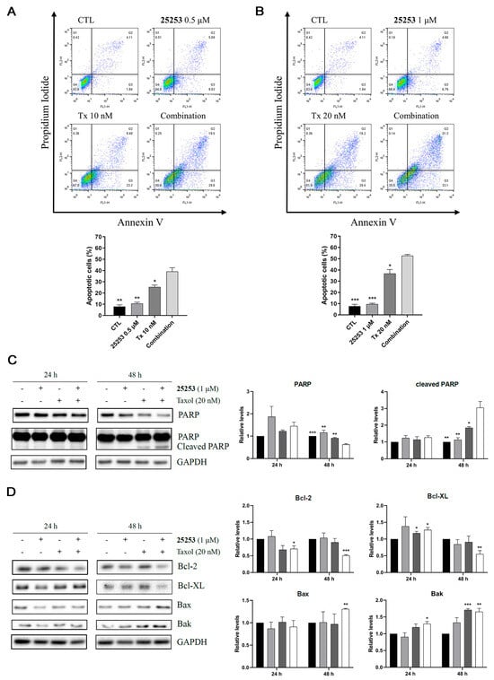 Propidium iodide (PI) staining followed by flow cytometric analysis was performed to evaluate the effect of the combination of 25253 and Taxol on cell cycle progression in ES-2 cells. As shown in Figure 4A,B, 0.5 or 1 μM 25253 had no apparent effects on cell cycle progression at both 24 and 48 h. In contrast, 10 or 20 nM Taxol (Tx) significantly disrupted cell cycle distribution at 24 h, notably increased the subG1 population (10 nM Tx, p < 0.01; 20 nM Tx, p < 0.001), and decreased the G0/G1 population (10 nM Tx, p < 0.01; 20 nM Tx, p < 0.001) compared to the control. These effects persisted after 48 h of treatment. The combination of 25253 and Taxol, both 0.5 μM 25253/10 nM Taxol and 1 μM 25253/20 nM Taxol, exhibited significant disruption of the cell cycle with subG1 populations higher than Taxol alone. These subG1 cells were not necessarily all apoptotic cells since it was demonstrated that low concentrations of Taxol prolonged mitosis and caused multipolar divisions, leading to an increase in the subG1 population in which some cells remained viable and non-apoptotic [15,16].