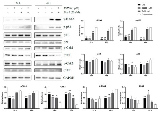 It has been reported that Taxol induces DNA damage after prolonged mitotic arrest and mitotic slippage [17]. Western blot analysis of DNA damage-related proteins was, then, conducted to determine whether 25253 could enhance the effect of Taxol. As demonstrated in Figure 6, 25253 enhanced the induction of a DNA damage marker, γ-H2AX, by Taxol in ES-2 cells after 24 and 48 h of treatment. Interestingly, the induction of γ-H2AX was low but apparent at 24 h, and the signal was significantly increased at 48 h, suggesting the accumulation of DNA damage. Checkpoint kinases such as Chk1 and Chk2 can be activated by phosphorylation after DNA double-strand breaks and transmit DNA damage signaling to p53 [18]. Phosphorylated Chk1 (p-Chk1) levels were upregulated and total Chk1 protein levels were downregulated by Taxol and the combination of Taxol and 25253 at both 24 h and 48 h. A similar trend in Chk2 was observed at 48 h. p53 was markedly phosphorylated at Ser15 (p-p53Ser15) by Taxol and the combination of Taxol and 25253 at both 24 h and 48 h. Of note, 25253 significantly enhanced p-p53Ser15 levels induced by Taxol, indicative of further p53 activation, which led to clear induction of its downstream effector p21 at 48 h. Taken together, the enhancement of DNA damage was evident at 24 h and further increased after 48 h of treatment. Additionally, the downstream signaling was activated, leading to p53 activation and, eventually, apoptosis. This DNA damaging effect may also contribute to the synergistic induction of apoptosis by 25253 and Taxol.