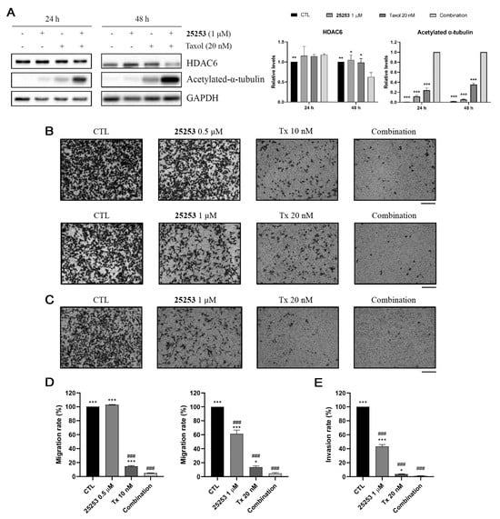Compound 25253 enhances the inhibitory effect of Taxol on cell migration and invasion in ES-2 cells. (A) Compound 25253 and Taxol synergistically downregulated HADC6 and induced acetylated α-tubulin. (B) Compound 25253 potentiated the inhibitory effect of Taxol on cell migration. (C) Compound 25253 potentiated the inhibitory effect of Taxol on cell invasion. (D) Quantitative data of cell migration. (E) Quantitative data of cell invasion. Transwell cell migration and invasion assays were conducted for 24 h. Data are presented as mean ± SEM of at least three independent experiments. * p < 0.05, ** p < 0.01, *** p < 0.001 vs. combination. ### p < 0.001 vs. CTL. Cell migration and invasion images were captured at a magnification of 100×. Scale bar: 200 μM.
