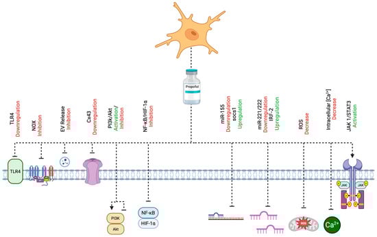 A comprehensive depiction of the cellular mechanisms through which propofol attenuates microglial activation and neuroinflammation in the context of ischemic stroke. Propofol exerts its neuroprotective effects via multiple molecular targets and signaling pathways, including the modulation of the PI3K/Akt cascade, inhibition of NOX, downregulation of TLR4 and Cx43, and activation of the JAK1/STAT3 pathway. It also regulates miRNA-mediated signaling, particularly the miR-155/SOCS1 and miR-221/222–IRF2 axes. Additional mechanisms include the suppression of the NF-κB/HIF-1α pathways, reduction in EV release, attenuation of oxidative stress via decreased ROS, and maintenance of intracellular Ca2+ homeostasis. Created with BioRender.com (URL accessed on 25 April 2025).
