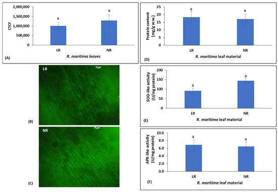 Specifically, the assessment of the intracellular H2O2 levels expressed as the value of the corrected total cell fluorescence (CTCF), was used as an indicator of oxidative stress [24,25,26]. The results showed that the CTCF values of LR and NR leaf samples of R. maritima did not differ significantly (p > 0.05) and were 1,009,977 and 1,292,208, respectively (Figure 1D–F). Thus, oxidative stress existed in R. maritima LR and it slightly changed after plant abscission (i.e., in NR samples). Like H2O2 levels, there were no statistically significant differences (p > 0.05) in the activity of SOD-like and APX-like between LR and NR samples (Figure 1A,B). In particular, SOD-like activity was 91.89 and 144.10 U/mg of protein in LR and NR samples, respectively (Figure 1A), while APX-like activity was 6.93 and 6.58 U/mg of protein in LR and NR samples, respectively (Figure 1B). Thus, as expected, since oxidative stress did not differ between LR and NR samples, their antioxidant response was also similar. Moreover, protein content in the LR sample (18.33 mg/g wet weight) was not significantly different (p > 0.05) from that of the NR sample (17.09 mg/g wet weight) (Figure 1C), indicating that there was not significant decomposition of the NR sample until the collection time. This observation was consistent with other studies demonstrating that marine angiosperms are highly resistant to decay [31].
