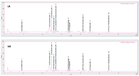 The individual phenolic compounds in the LR and NR extracts were determined by UHPLC-DAD analysis as described previously [16] (see also Supplementary File S1). Identification and quantification of the individual phenolic compounds in all samples were based on the following standards: caftaric acid (purity > 97%, Sigma-Aldrich), chicoric acid (purity > 98%, Glentham, Corsham, UK), quercetin-3-O-glucopyranoside (purity > 99%, Extrasynthese, Genay Cedex, France), caffeic acid (purity 99%, J&K Scientific, Shanghai, China), (-)-epigallocatechin gallate (purity 95%, Thermo Fisher Scientific, Waltham, NE, USA), p-coumaric acid (purity 98%, Sigma Aldrich), trans-ferulic acid (purity 99%, Sigma Aldrich), sinapic acid (purity 98%, Sigma Aldrich), rutin hydrate (purity > 94%, Sigma Aldrich), trans-cinnamic acid (purity 99%, Sigma Aldrich), hesperidin (purity 95%, Sigma Aldrich), and 4′,5,7-trihydroxyflavone (purity 97%, Thermo Fisher Scientific, Waltham, NE, USA) (see Supplementary File S1 for details). Subsequently, the standards were diluted in methanol at concentrations ranging from 0.78 to 200.00 mg/L to construct calibration curves (Supplementary File S1), and analyzed at 280, 270, 328, and 318 nm. The phenolic content of the extracts was analyzed at 7.0 mg/mL in methanol. Moreover, considering the extraction yield (%) of each extract, the phenolic compounds were also quantified in mg/g of d.w. of the initial LR and NR materials.