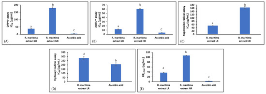 The IC50 values (μg/mL) of scavenging activity against (A) DPPH•, (B) ABTS•+, (C) hydroxyl (OH•), and (D) superoxide (O2•−) radicals, and (E) RP0.05AU values of reducing power of the Ruppia maritima extracts from living plant (LR) and beach deposit (ΝR) samples. The NR extract did not exhibit an IC50 value in the hydroxyl radical assay at the tested concentrations (i.e., until 1000 μg/mL). Values are the mean ± SD of at least three independent experiments. Different lowercase letters denote significantly different values between the two extracts (p < 0.05).