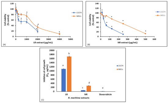 Dose-dependent inhibition of (A) living plant (LR) and (B) beach deposit (NR) extracts against growth in colon cancer cells (LS174) and mesenchymal stem cells (MSCs). (C) IC50 values (μg/mL) of Ruppia maritima LR and NR extracts against LS174 and MSC growth. Values are the mean ± SD of at least three independent experiments. Different lowercase letters denote significantly different values between the two extracts (p < 0.05). (*) Statistically significant difference from control (i.e., untreated) cells (p < 0.05).