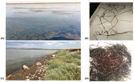 We collected plants of the submerged brackish water angiosperm R. maritima Linnaeus in early July 2022 from a depth of 60 cm from the ‘Monolimni’ Lagoon (40°46′ N, 22°03′ E) of the Evros River Delta (northern Aegean Sea, Greece). The ‘Monolimni’ Lagoon occupies an area of approximately 1.12 km2, connects to the sea through a 15 m wide opening, and is permanently flooded. In the collection period, the composition of the vegetation in the inner part of this lagoon was homogeneous, consisting mainly of R. maritima plants (Figure 5A) and the macroalga Gracilaria bursa-pastoris. In this area, the perennial population of R. maritima grows from April to October and reproduces during summer, in the innermost part of the permanent Monolimni Lagoon [4]. Like other perennial Ruppia populations growing in the Mediterranean area, plant decomposition is observed after early to mid-summer, and then from early or mid-autumn onwards, leading to beach deposits on the shores [4].