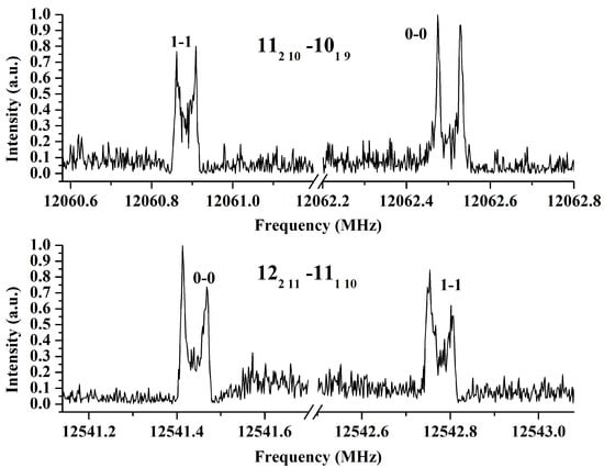 - Pickett, H. The Fitting and Prediction of Vibration-Rotation Spectra with Spin Interactions. J. Mol. Spectrosc. 1991, 148, 371–377. [Google Scholar] [CrossRef]