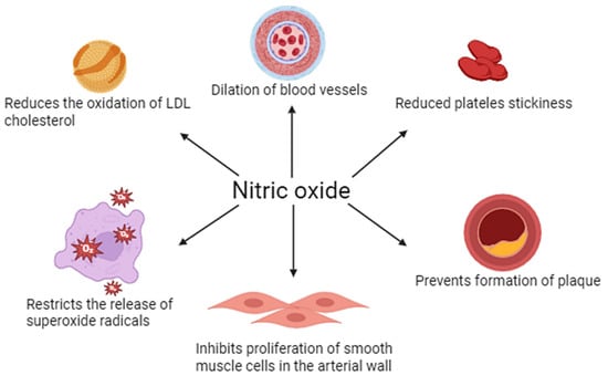 In addition, NO can modulate the activity of key signaling enzymes, such as cyclooxygenases (COX), protein kinases, including protein kinase C (PKC), or apoptotic enzymes, thereby affecting inflammation, proliferation, and cell death. By regulating the translation, translocation, and stability of signaling proteins, NO also plays an important role in intercellular communication and adaptive cellular responses []. One of the best-known effects of NO is its role in vasodilation. It works by relaxing vascular smooth muscle, leading to lower blood pressure and improved blood flow. This process happens very quickly—nitric oxide acts almost immediately upon release, but is just as quickly neutralized and removed, making its presence in the blood last only a few seconds. This short duration of action makes NO ideal for precise and momentary regulation of vascular function [,,].