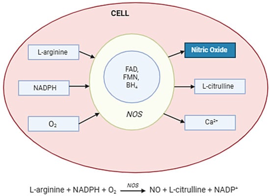 Nitric oxide synthesis in the cell. Abbreviations: NOS enzyme—nitric oxide synthase; Arginine (L-arginine)—the main substrate; O2—molecular oxygen; NADPH—as an electron donor; BH4—tetrahydrobiopterin; FAD, FMN, hem—cofactors and auxiliaries; NO—diffuses across the membrane; Citrulline—a by-product.