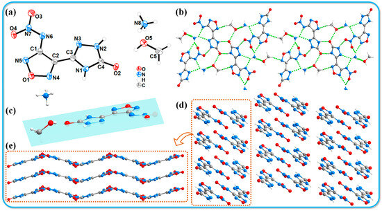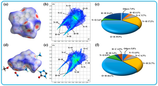 An appropriate amount of compound 3 was dissolved in 5 mL of a 1:1 methanol/water solution and allowed to slowly evaporate over a period of two weeks under controlled temperature and humidity conditions, resulting in the formation of yellow block-shaped crystals. An appropriately sized crystal was chosen for X-ray single-crystal diffraction analysis. The labeled single-crystal structure and the crystal stacking diagram are shown in Figure 2. The specific crystallographic data are summarized in Table 1. Compound 3 crystallizes in the monoclinic system with a space group of P21/n and includes four molecules per unit cell. The crystal density (1.630 g·cm−3) was determined at 116 K. Figure 2a shows the thermal ellipsoid diagram of the single molecule, indicating that the methanol molecules co-crystallize with the host molecules during the crystallization process. The presence of ammonium cations and methanol molecules significantly expands the hydrogen bond network within the molecular structure, enhancing the diversity of hydrogen bonds. The following hydrogen bonds have been identified in the molecular framework: N1-H1···O2 (2.81 Å), N2-H2···O3 (2.77 Å), O5-H5···O2 (2.83 Å), N8-H8A···O5 (2.96 Å), N8-H8B···O5 (2.84 Å), N8-H8C···C···N3 (3.07 Å), N8-H8C···N6 (2.92 Å), N8-H8D···O4 (3.00 Å), N8-H8D···N5 (3.10 Å), and C5-H5C···N4 (3.45 Å). The diverse types of hydrogen bonds connect the molecules to form a one-dimensional chain structure, as illustrated in Figure 2b. The host molecule exhibits notable planarity (see Figure 2c). Figure 2d,e depict the stacking structure of compound 3, which demonstrates a wave-like stacking arrangement. This particular stacking configuration effectively reduces the mechanical sensitivity of the compound, consistent with the experimental observations. In addition, we used CrystalExplorer software (v21.5) [33] to draw Hirshfeld surface and 2D fingerprint plots (shown in Figure 3) and analyzed the interaction forces between molecules, including hydrogen bonds and π-π interactions. The details are shown in the Supporting Information (Section S3).