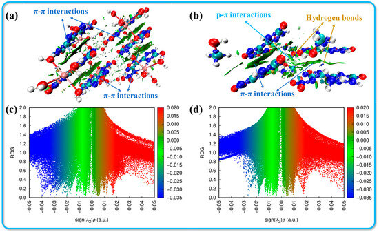 To provide a clearer depiction of the non-covalent interactions present in these crystal structures, the analysis includes calculating non-covalent interactions (NCIs) using the gradient isosurface method. As suggested by Johnson et al., the reduced density gradient (RDG) isosurface, colored according to the NCI diagram, enables the identification of different types of forces present through distinct color regions. The results obtained from Multiwfn and VMD are presented in Figure 4 [34]. When combined with the Hirshfeld surface analysis, it becomes straightforward to identify the blue and green small ovals in the NCI image, which correspond to hydrogen bonds. These regions signify a high electron density, where dark blue areas indicate stronger attractive interactions. This observation confirms the presence of significant hydrogen bonding between the hydrogen atom in the cation and the oxygen or nitrogen atoms in the anion. Furthermore, owing to the planar configuration and layered stacking structure observed in both crystal systems, the large green areas between adjacent parallel molecules suggest a rich presence of π-π interactions within the structure. These interactions contribute to enhanced molecular stability and reduced sensitivity of the compounds, emphasizing the importance of non-covalent interactions in determining the physical properties of the crystals.