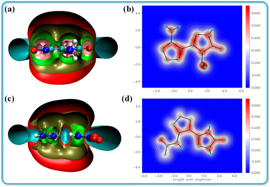 This indicates that the negative values assigned to the magnetic shielding parameters, which are not centered at the nucleus, are artificially determined. A more negative shielding value reflects stronger magnetic field shielding, which is indicative of enhanced aromaticity [37,38]. As illustrated in Figure 6a, the ICSS cutting plane reveals a pink region on the shielding surface of compound 1, suggesting that it exhibits strong aromaticity. Both compounds display near-planar molecular structures; however, the ICSS cutting plane for compound 2 shows a slight displacement of the N-NO2 group relative to the parent ring. Furthermore, the Localized Orbital Locator for π (LOL-π) is another significant index used to assess the stability of the π electron distribution within the compounds, as depicted in Figure 6b,d. The isosurface value for LOL-π is set at 0.4. The π electrons in both compounds 1 and 2 demonstrate a uniform distribution across the triazole ring, furazan ring, and azide group. Notably, the red region in compound 1 is darker, indicating a robust conjugated system. In contrast, the initial color of compound 2 at the N-NO2 position is lighter, signifying weaker conjugation in that area.