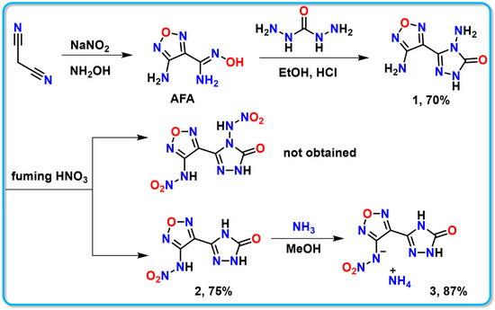 The triazolofurazane compound 1 (4-amino-5-(4-amino-1,2,5-oxadiazol-3-yl)-2,4-dihydro-3H-1,2,4-triazol-3-one) was synthesized through a simple and straightforward three-step reaction using malononitrile as a starting material [32]. The intention was to synthesize dinitroamino compounds via a nitration reaction. However, during this process, the nitro group on the triazole underwent hydrolysis, leading to the formation of compound 2 (N-(4-(5-oxo-4,5-dihydro-1H-1,2,4-triazol-3-yl)-1,2,5-oxadiazol-3-yl) nitramide) (Scheme 1).