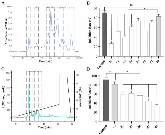 Fractionation and purification of ACE-inhibitory peptides from crucian carp swim bladder hydrolysates. (A) Gel filtration chromatography (Sephadex G-25) of the enzymatic hydrolysate yielded eight fractions (F1–F8), monitored at 280 nm. (B) ACE-inhibitory activities of fractions F1–F8. Fraction F8 exhibited the highest inhibitory activity among all fractions, though slightly lower than that of captopril (as positive control). (C) Reverse-phase HPLC separation of F8 using a linear acetonitrile gradient in 0.2% formic acid (3–63 min), resulting in six subfractions (R1–R6). (D) ACE-inhibitory activities of subfractions R1–R6. R1 exhibited the strongest activity and was selected for further purification and peptide identification. Data are expressed as mean ± SD (n = 3). * p < 0.05; ns = not significant.