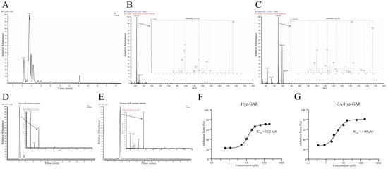 To verify the accuracy of the sequencing results, the synthetic peptides Hyp-GAR and GA-Hyp-GAR were analyzed under identical chromatographic and mass spectrometric conditions. As shown in Figure 2D,E, the retention times and m/z values of the synthetic peptides were in full agreement with those observed in the R1 fraction, thereby confirming the reliability of the peptide identification. Subsequently, the ACE-inhibitory activities of the synthetic peptides were assessed. As illustrated in Figure 2F,G, the IC₅₀ values for Hyp-GAR and GA-Hyp-GAR were determined to be 12.2 μM and 4.00 μM, respectively, indicating notable ACE-inhibitory activity.