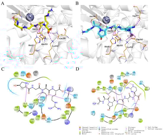 Molecular docking analysis of peptides Hyp-GAR and GA-Hyp-GAR with angiotensin-I-converting enzyme (ACE). (A,B) Three-dimensional docking models showing the binding conformations of Hyp-GAR (A) and GA-Hyp-GAR (B) within the active site of ACE. Key interacting residues are labeled, and the zinc ion (Zn2⁺) is represented as a grey sphere. (C,D) Two-dimensional interaction diagrams of Hyp-GAR (C) and GA-Hyp-GAR (D) with ACE, highlighting hydrogen bonds, salt bridges, hydrophobic interactions, and metal coordination.