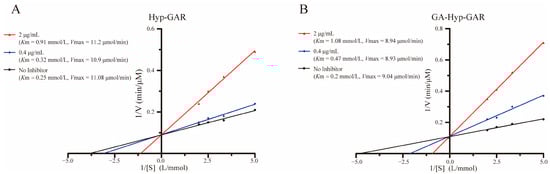 The inhibitory mechanisms of peptides Hyp-GAR and GA-Hyp-GAR against ACE were further investigated through kinetic analysis using Lineweaver–Burk plots. Based on the ACE-inhibitory assay described in Section 2.3, reactions were conducted at varying concentrations of the substrate FAPGG (0.2, 0.3, 0.4, and 0.5 mmol/L), in both the absence and the presence of peptide inhibitors at two concentrations (0.4 µg/mL and 2.0 µg/mL). Initial reaction velocities were calculated as previously described, and Lineweaver–Burk double reciprocal plots were constructed by plotting 1/[S] against 1/v, where [S] is the substrate concentration and v is the reaction velocity. The mode of inhibition for each peptide was determined by analyzing the intersection patterns of the fitted regression lines on the plots [43].