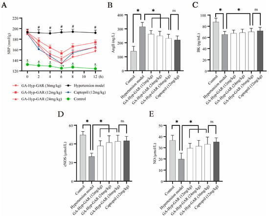 Antihypertensive effects of GA-Hyp-GAR in spontaneously hypertensive rats and modulation of vascular biomarkers. (A) Time course of systolic blood pressure (SBP) following oral administration of GA-Hyp-GAR at 12, 24, and 36 mg/kg, compared to captopril (12 mg/kg), the hypertensive model group, and normotensive controls. The maximal SBP reduction was observed at 6 h post-treatment in the high-dose group (60 mmHg), comparable to that of captopril (56 mmHg). (B) Plasma levels of angiotensin II (Ang II), which were elevated in the model group, were significantly reduced by GA-Hyp-GAR in a dose-dependent manner. (C) Bradykinin (BK) levels, suppressed in hypertensive rats, were restored following GA-Hyp-GAR treatment. (D,E) GA-Hyp-GAR administration upregulated endothelial nitric oxide synthase (eNOS) and increased nitric oxide (NO) levels compared to the model group. Data are presented as mean ± SD (n = 6). * p < 0.05 vs. model group; # p < 0.05 vs. control group; ns = not significant.