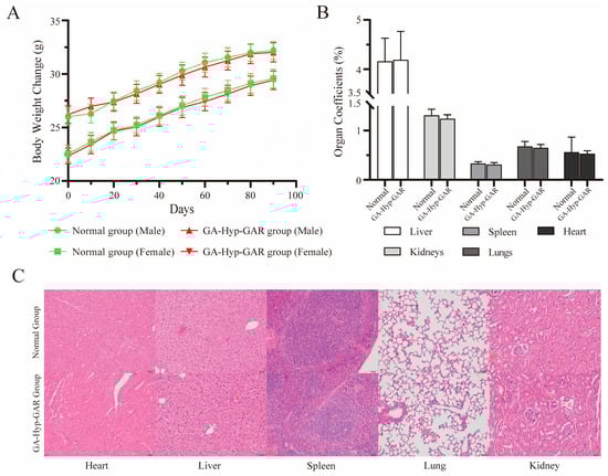 To further evaluate potential structural or functional alterations in major organs, mice were euthanized at the end of the study, and the liver, kidneys, spleen, lungs, and heart were excised, weighed, and subjected to histological examination. As shown in Figure 6B, organ coefficients did not differ significantly between the GA-Hyp-GAR-treated and normal groups (p > 0.05), indicating the absence of gross organ swelling or atrophy. Histopathological analysis revealed no observable pathological changes in any of the examined organs (Figure 6C). Tissue architecture remained intact, with no evidence of inflammation, necrosis, fibrosis, or other structural abnormalities. These results further confirm the absence of histological toxicity following prolonged oral administration of GA-Hyp-GAR at 50 mg/kg/day.