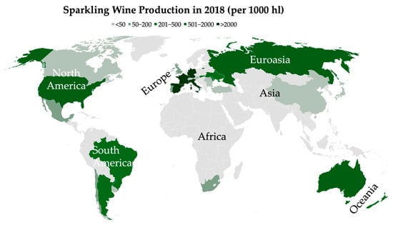 The traditional method is the most widely technique for high-quality sparkling wine production and gives rise to some of the most renowned sparkling wines in the world such as Champagne (France), Cava (Spain), Franciacorta (Italy), Sekt (Germany), and Cap Classique (South Africa) [4,6]. The success of this method has led to its adoption in various wine-producing regions such as the United Kingdom, Portugal, Brazil, and Australia, contributing to the expansion and diversification of the global sparkling wine industry [7]. As shown in Figure 1, Europe (Spain, France, Italy, and Germany) led the sparkling wine production in 2018, followed by Asia and America [4].