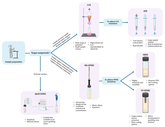 Conceptual decision diagram illustrating the selection of sample preparation techniques for the analysis of volatile and semi-volatile compounds in sparkling wines. The techniques are described in Section 3.1.1, Section 3.1.2, Section 3.1.3, Section 3.1.4, Section 3.1.5 and Section 3.1.6.